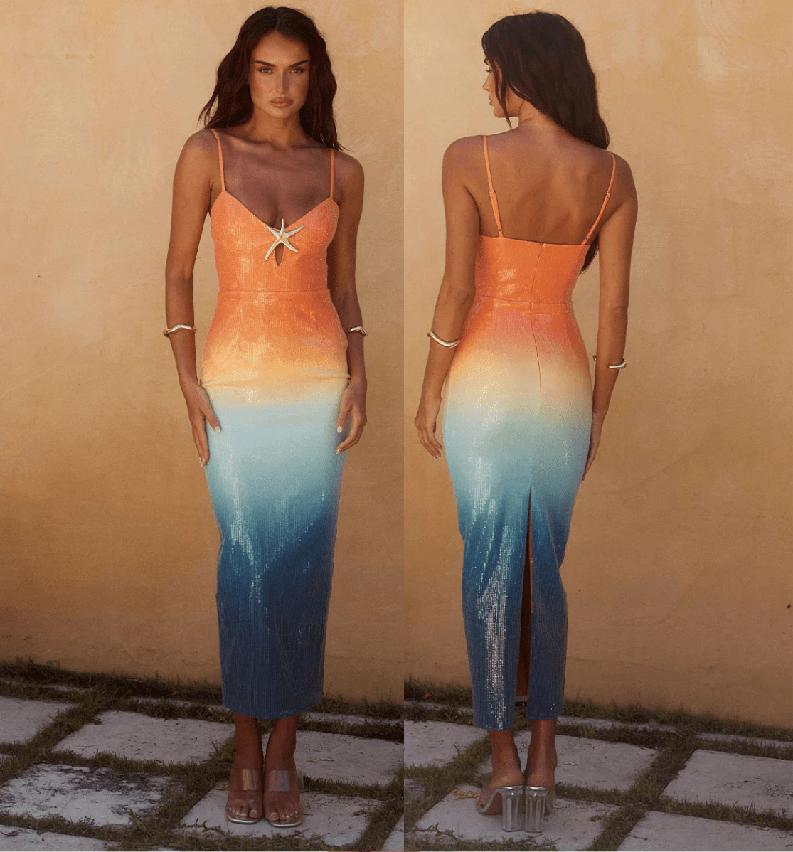 Indulge in luxury with AZUREA, our elegant Midi Dress. With a low neckline and alluring cutout adorned with a starfish brooch, this dress will turn heads. Made from delicate sequin fabric, it features a hidden zipper and split at the back, while offering a comfortable, slight stretch lining. Be the star of any occasion with AZUREA.