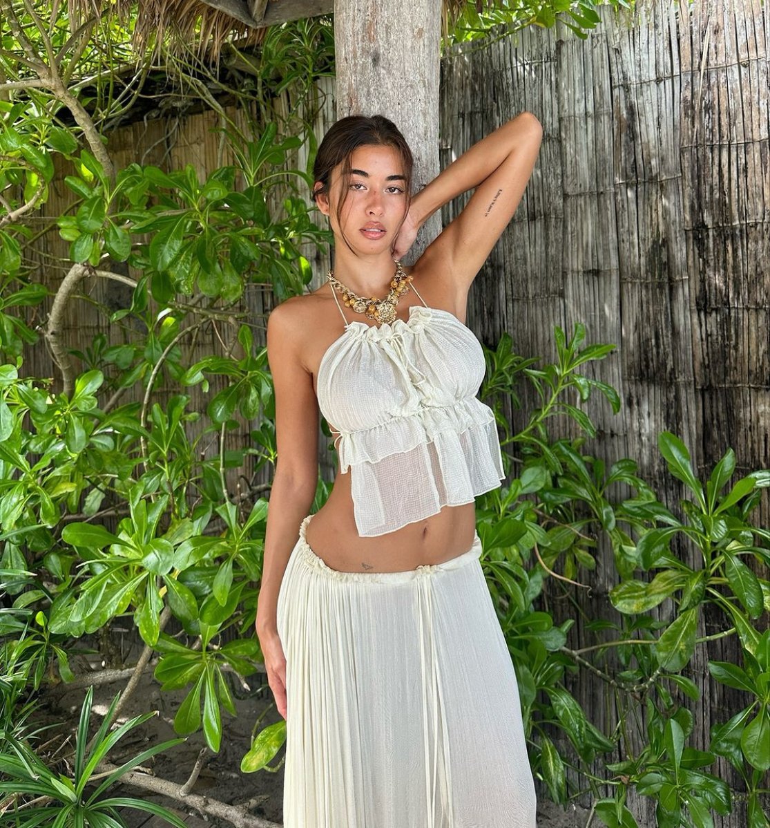 Indulge in luxury with BECCA's sling tie up top and skirt co ord. This beachy set is the perfect addition to your tropical vacation fits, giving you a taste of the exotic wherever you go. Elevate your style with this exclusive and elegant ensemble.