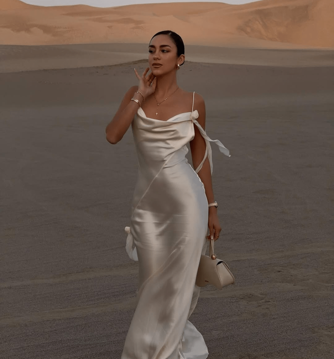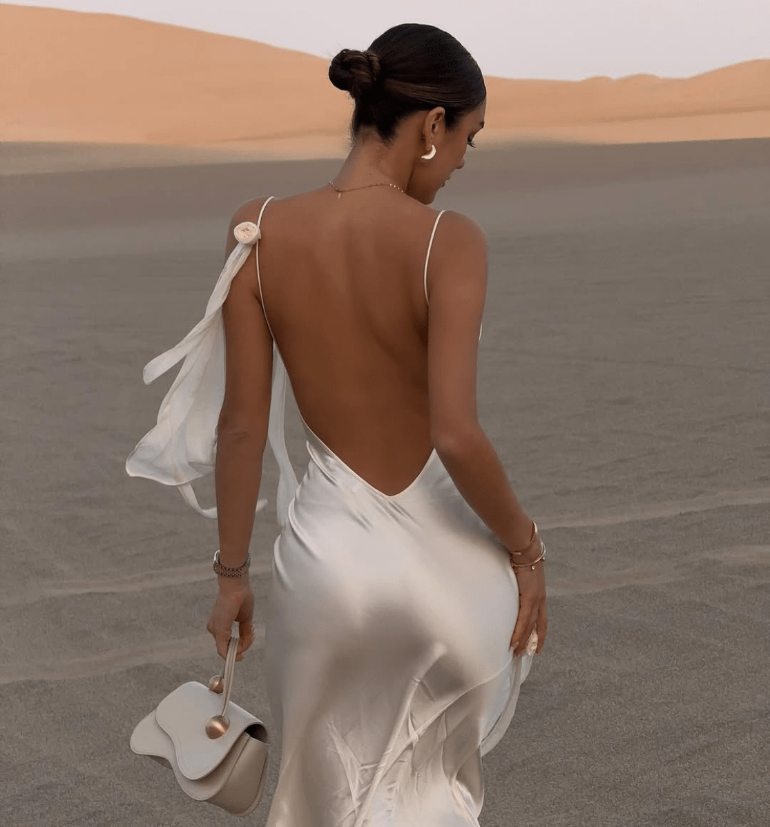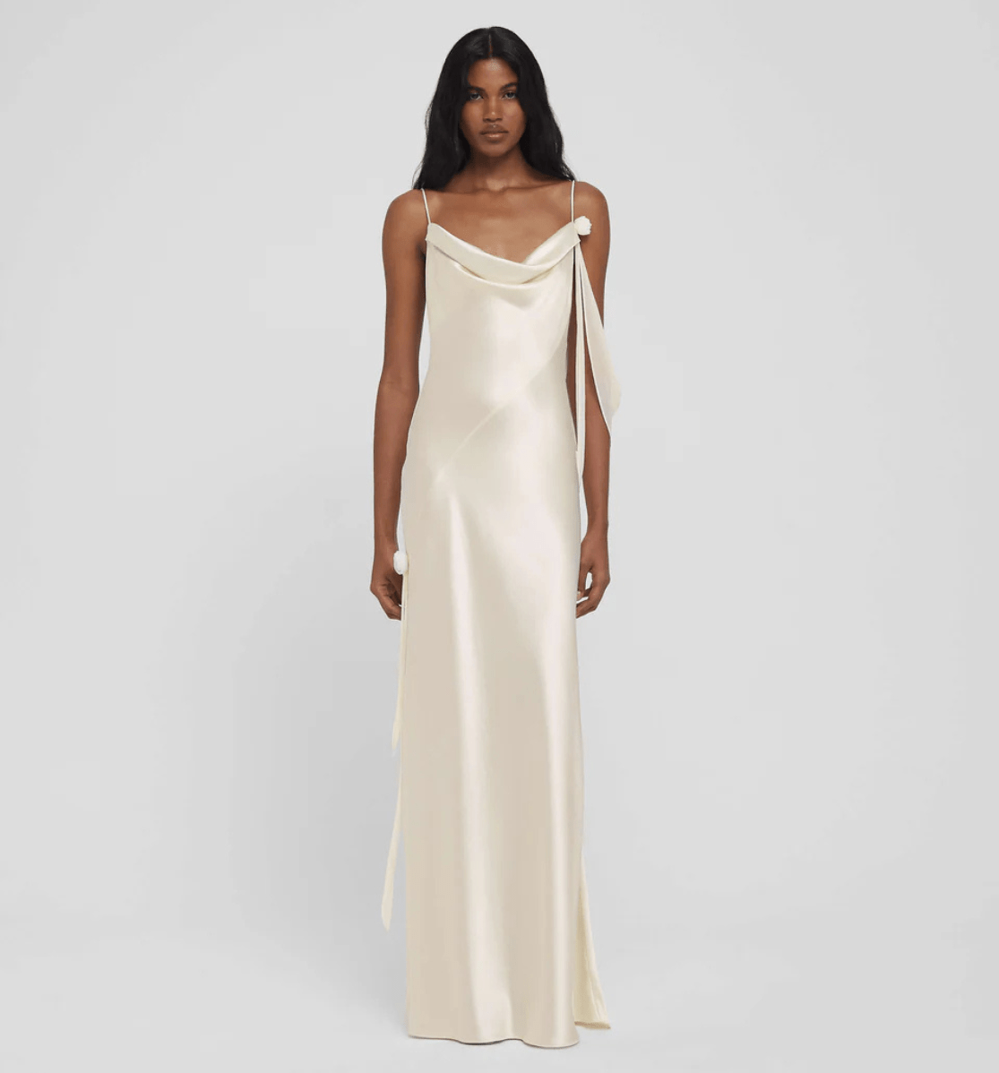 Indulge in effortless elegance with BY THE AISLE satin maxi dress. The cowl neck and chic shoulder detail exude simplicity and sophistication, while the lustrous satin fabric flatters your curves. The straps can be tailored to your fit, and the bias cut molds to your body for a flattering drape. Alter for your desired fit.