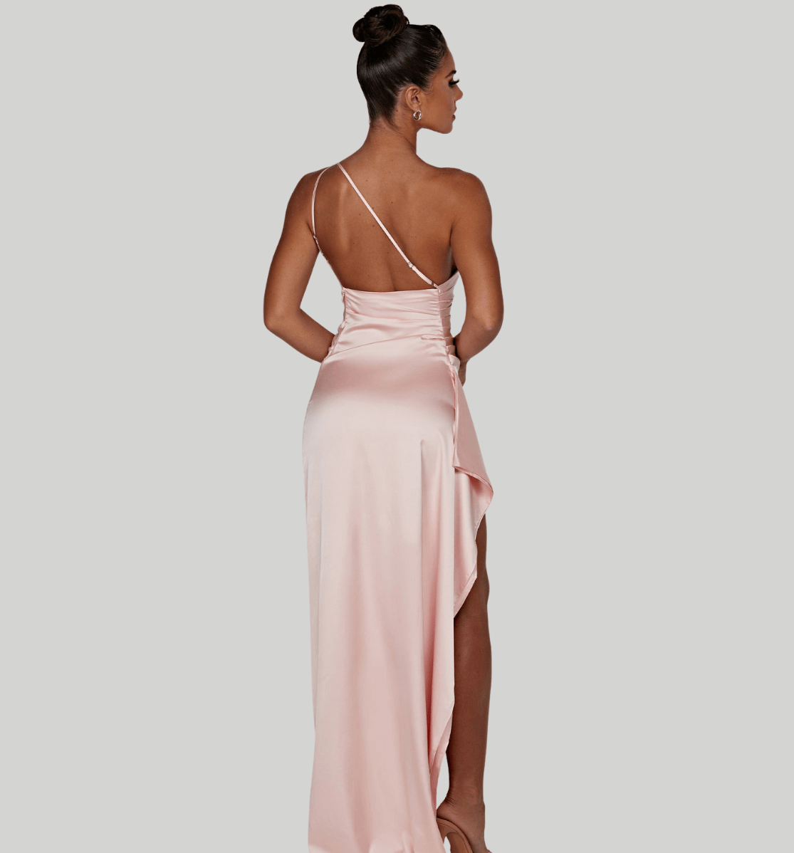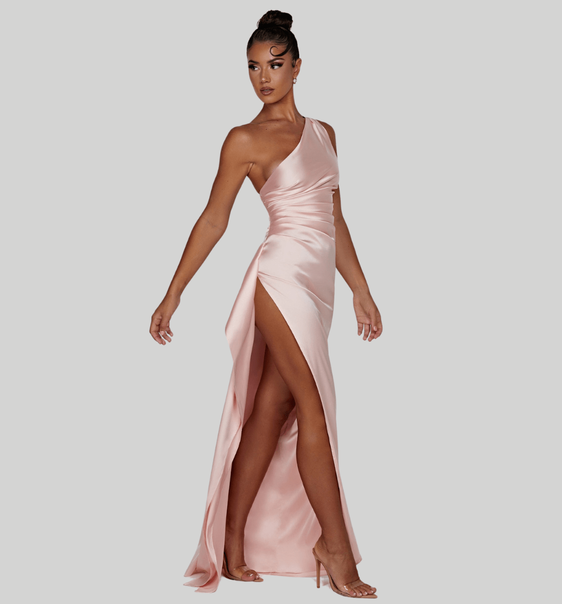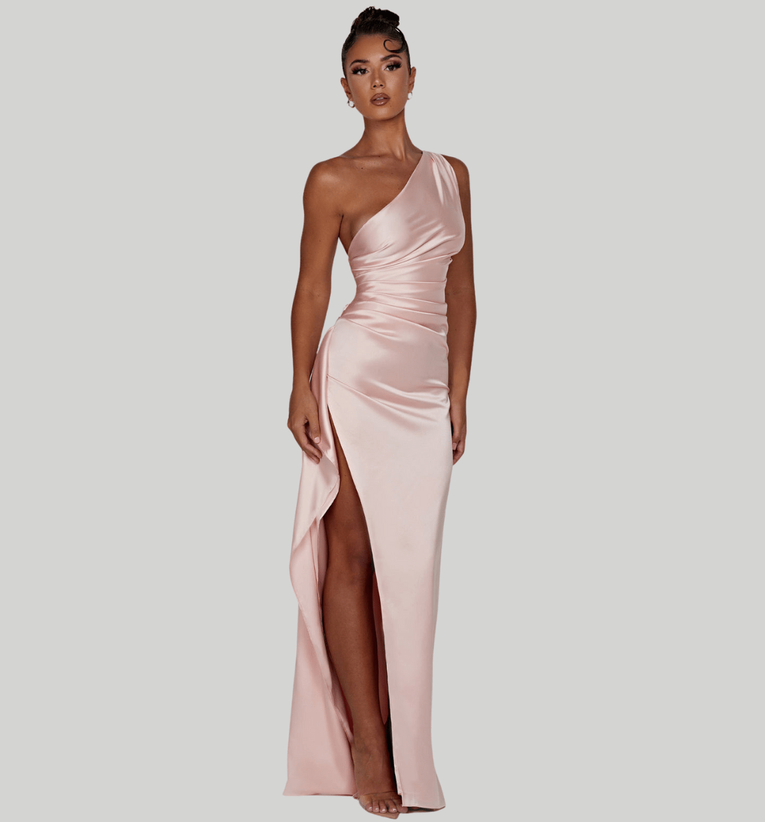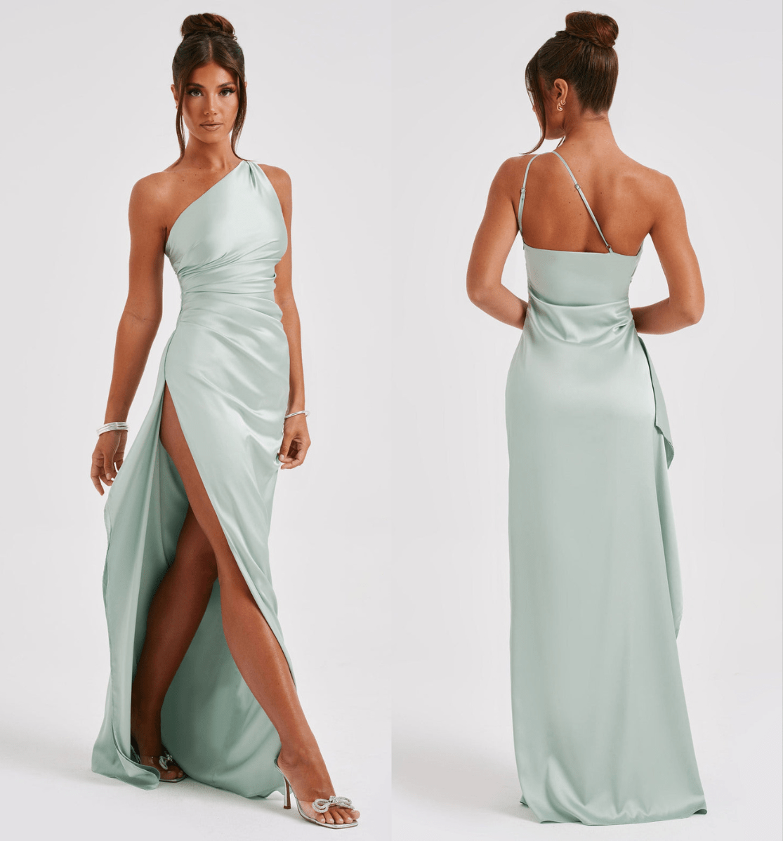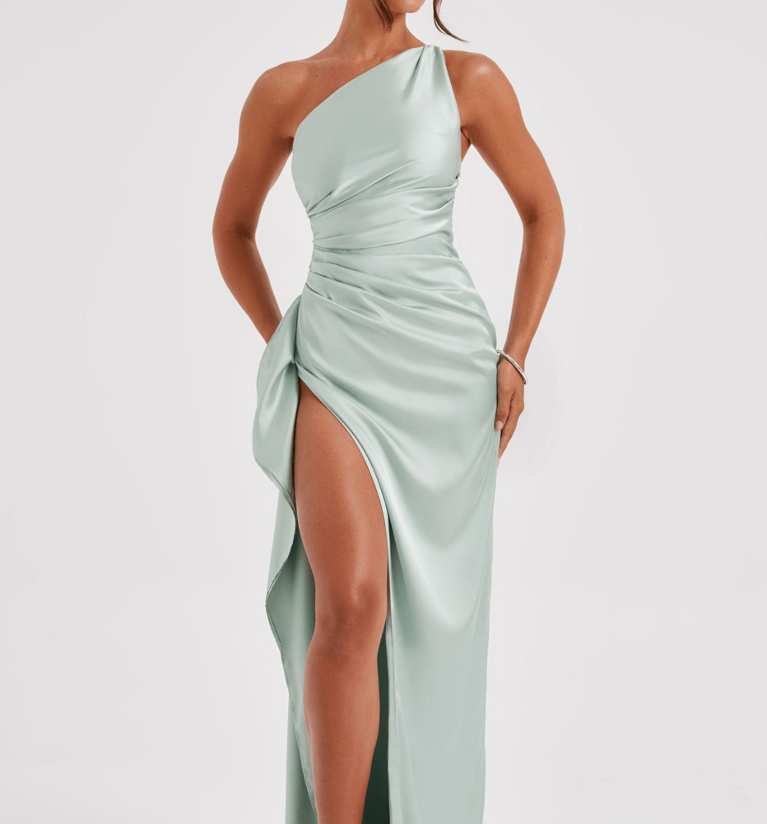 Introducing DIANA, the Queen's dress. Our premium, lightweight satin gown features a one-shoulder design and draped detailing, giving it a sophisticated, exclusive look. The maxi dress sweeps the floor with a thigh-high split for a touch of daring elegance. Perfect for a night out, style DIANA with sleek hair, a mini bag, and heeled mules for a chic, royal look.