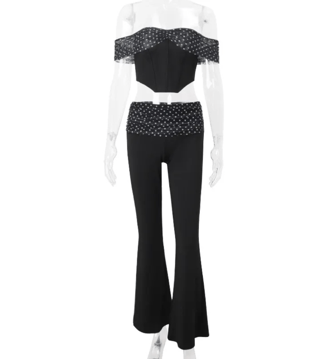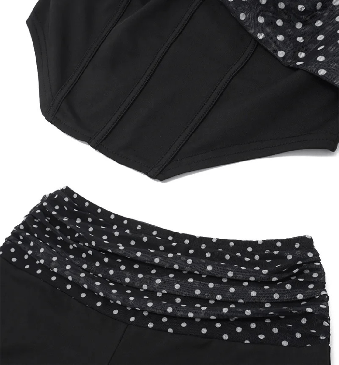 Flirty, fun, and full of polka dots—The DOT AFFAIR Co-ord features a jersey off-shoulder top with corset bodice and matching pants with playful mesh detailing and a snug fit.