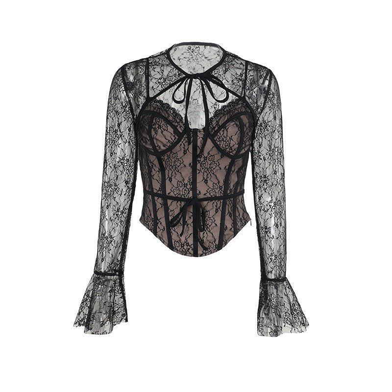 Indulge in the captivating beauty of our 'GILDED' Long-Sleeved Lace Corset Top, a delicate blend of romance and allure. The exquisite lace overlay draws admiration, while the corset design sculpts your figure to perfection. The elegant long sleeves and detachable bolero add sophistication and versatility. A charming ribbon tie cinches your waist for an enchanting hourglass silhouette. Perfect for a magical evening.