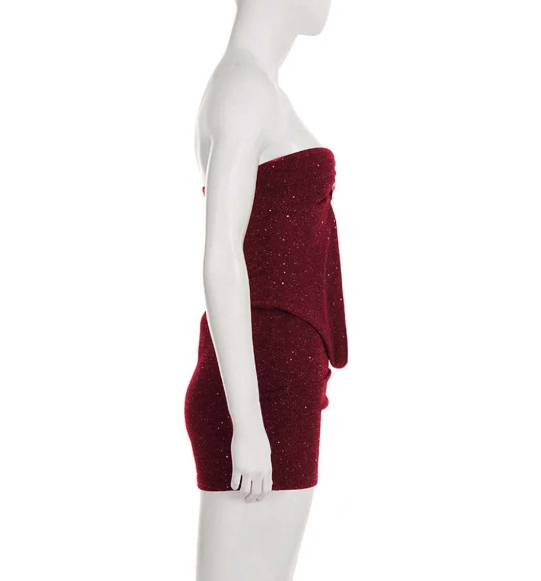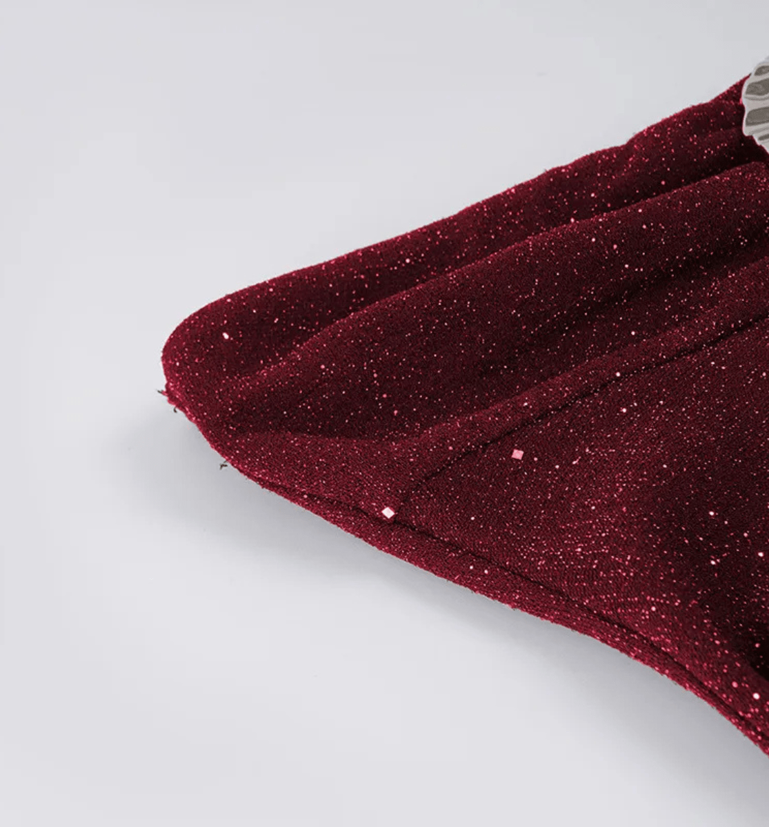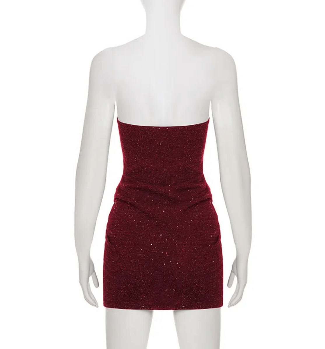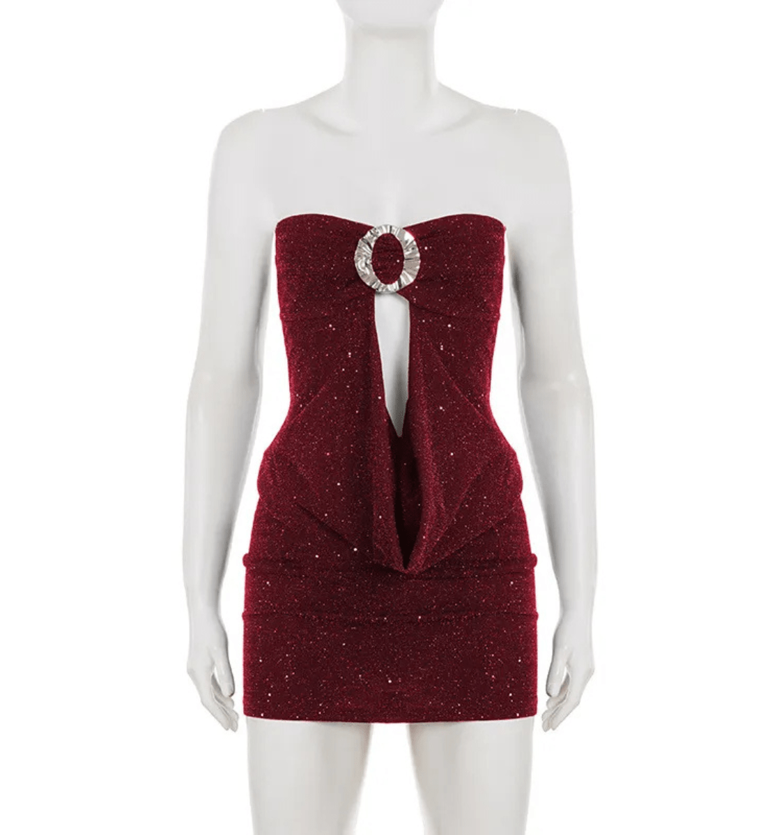 Glitter mini dress with a plunging neckline and statement hardware detailing, perfect for Christmas parties, festive nights out and glamorous holiday events.
