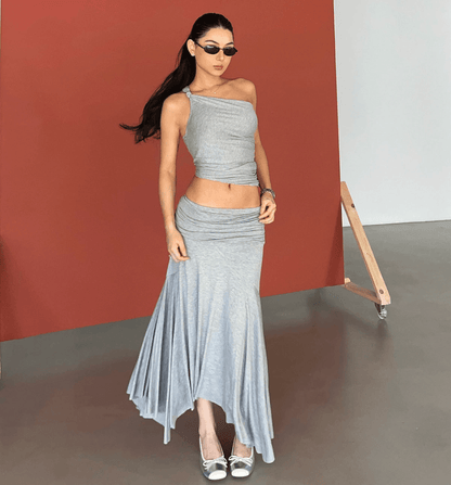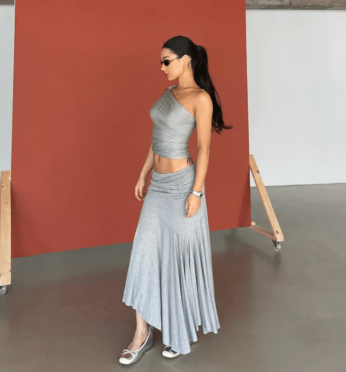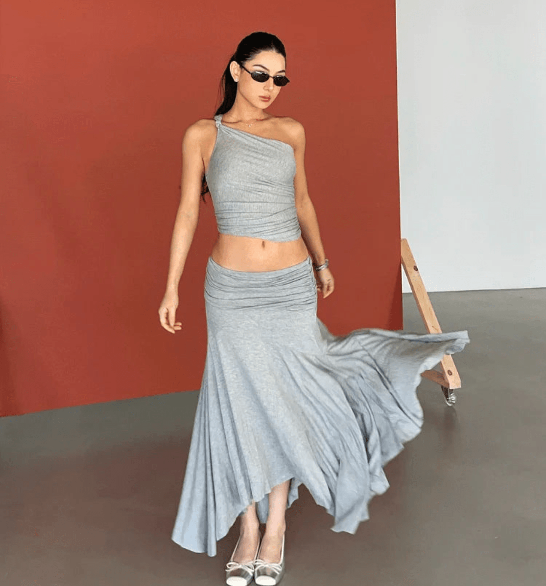 Turn heads in the LALI Co-ord – featuring a one-shoulder drop top, gathered waist, and flowy hem skirt. The ultimate chic, model-off-duty statement set.
