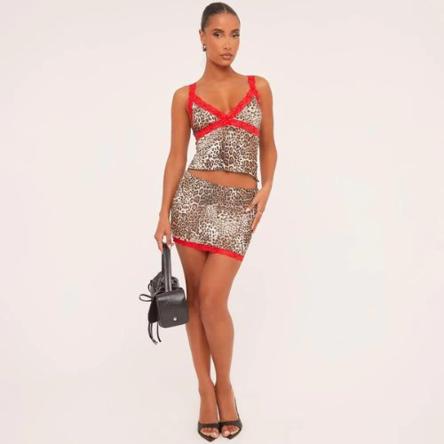 Complete your wild and bold look with JUST KITTEN's Leopard Print Co Ord with a Lace Trim Slip Top and Mini Skirt. The soft and delicate lace trim adds a touch of femininity to this fierce ensemble. Perfect for a night out, this co-ord is sure to turn heads.