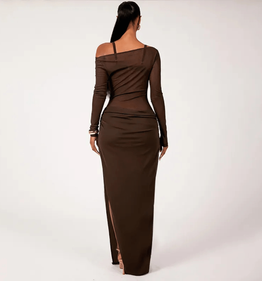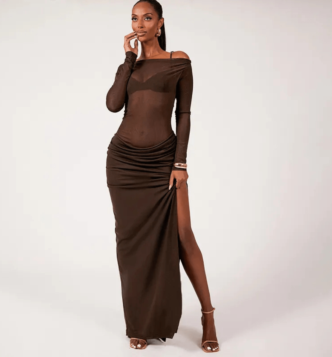 Sexy brown sheer maxi dress, lined waist down with draped waist detail. Features a chic mermaid hem, creating a sultry, elegant silhouette for any occasion.