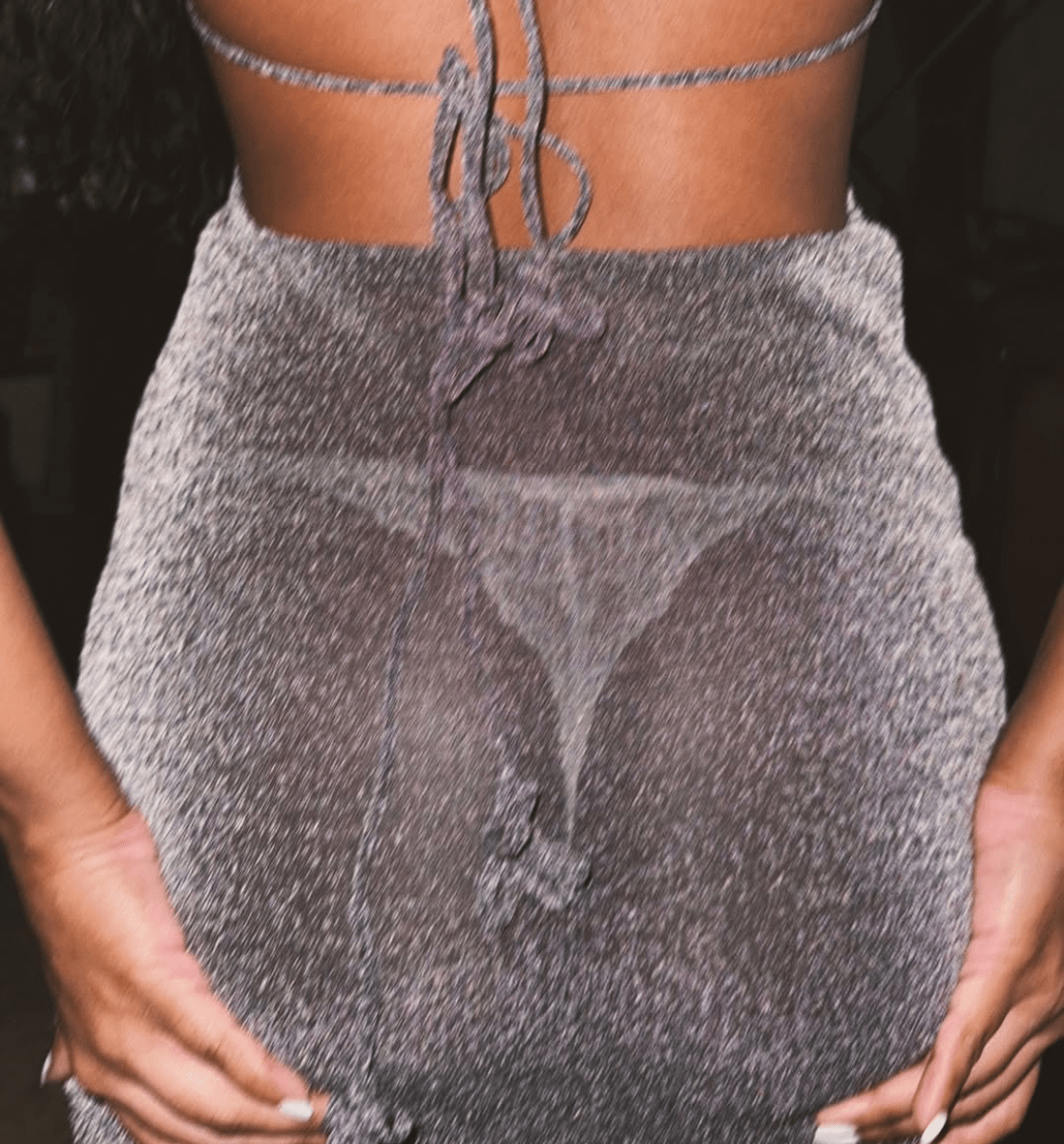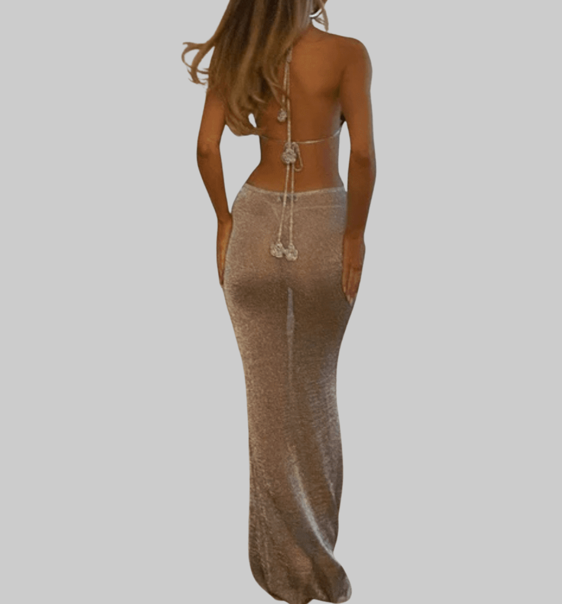 Introducing our LAZARA Maxi Dress in Silver! This shimmer creation, stands out with a sheer design that accentuates your figure. With a triangle-shaped bust and tie-up neckline for a perfect fit, it also features cut-out details and feminine flowers.