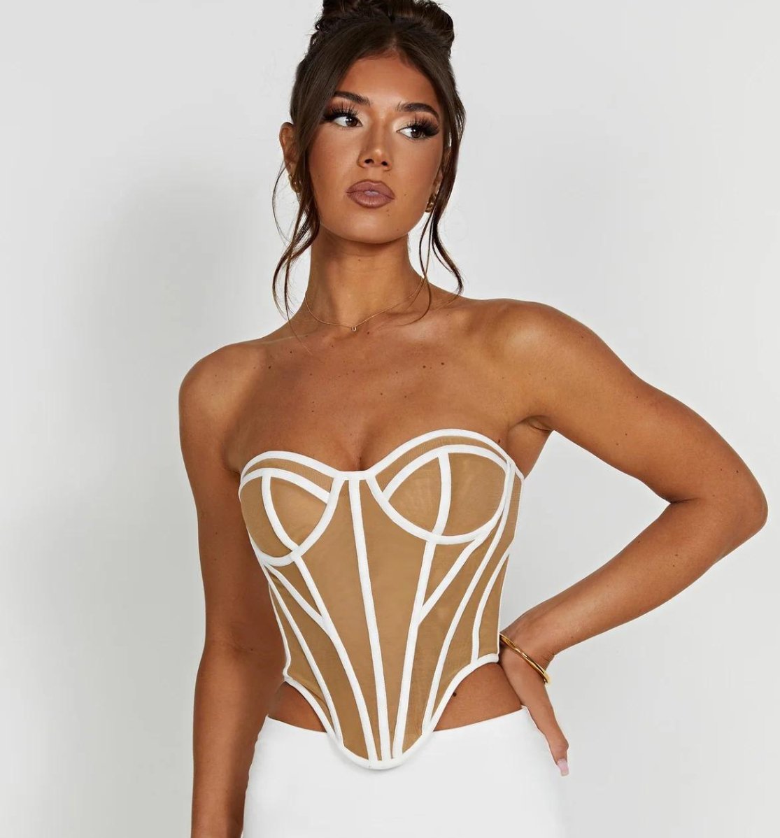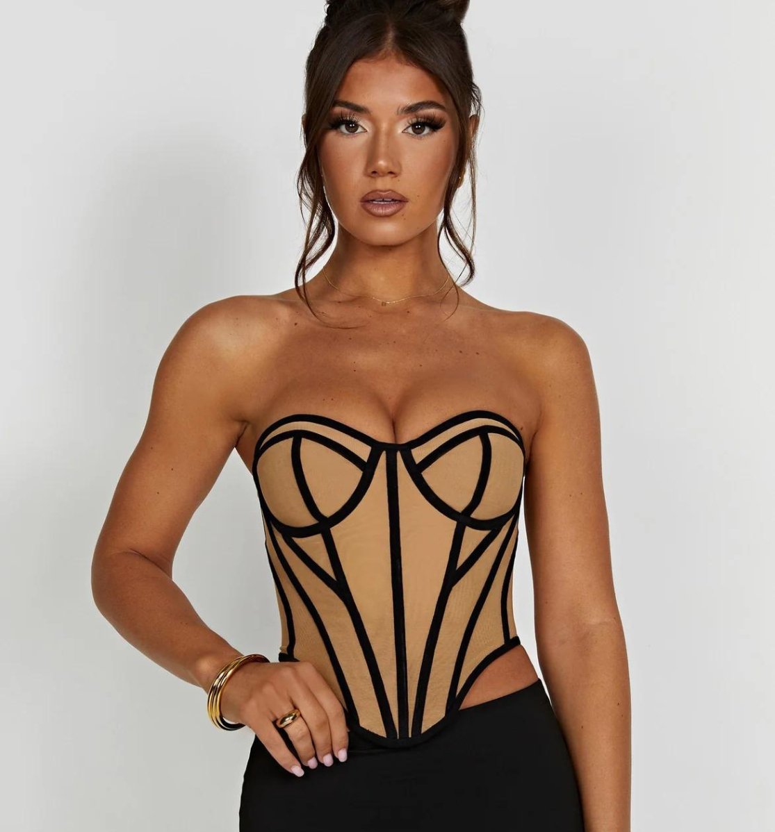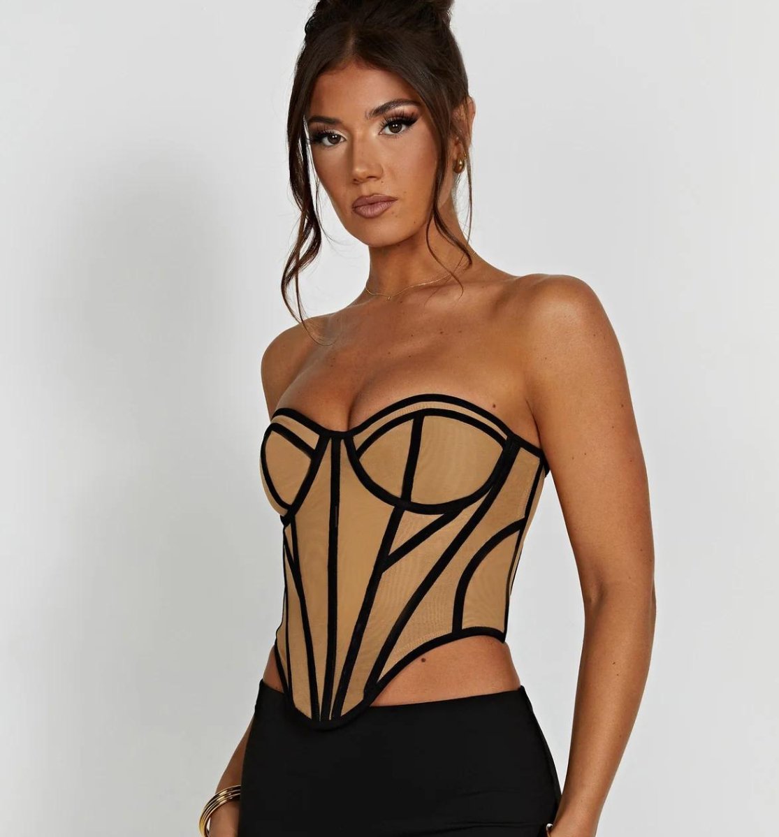 Indulge in the ultimate luxury with our LET'S BRUNCH CORSET. Made from delicate lingerie mesh, this sleek and sexy piece features signature boning for a sculpted waist and torso. The cupped bust and flattering dipped hem add to its exclusive appeal. Elevate your style with this elegant and sophisticated corset.