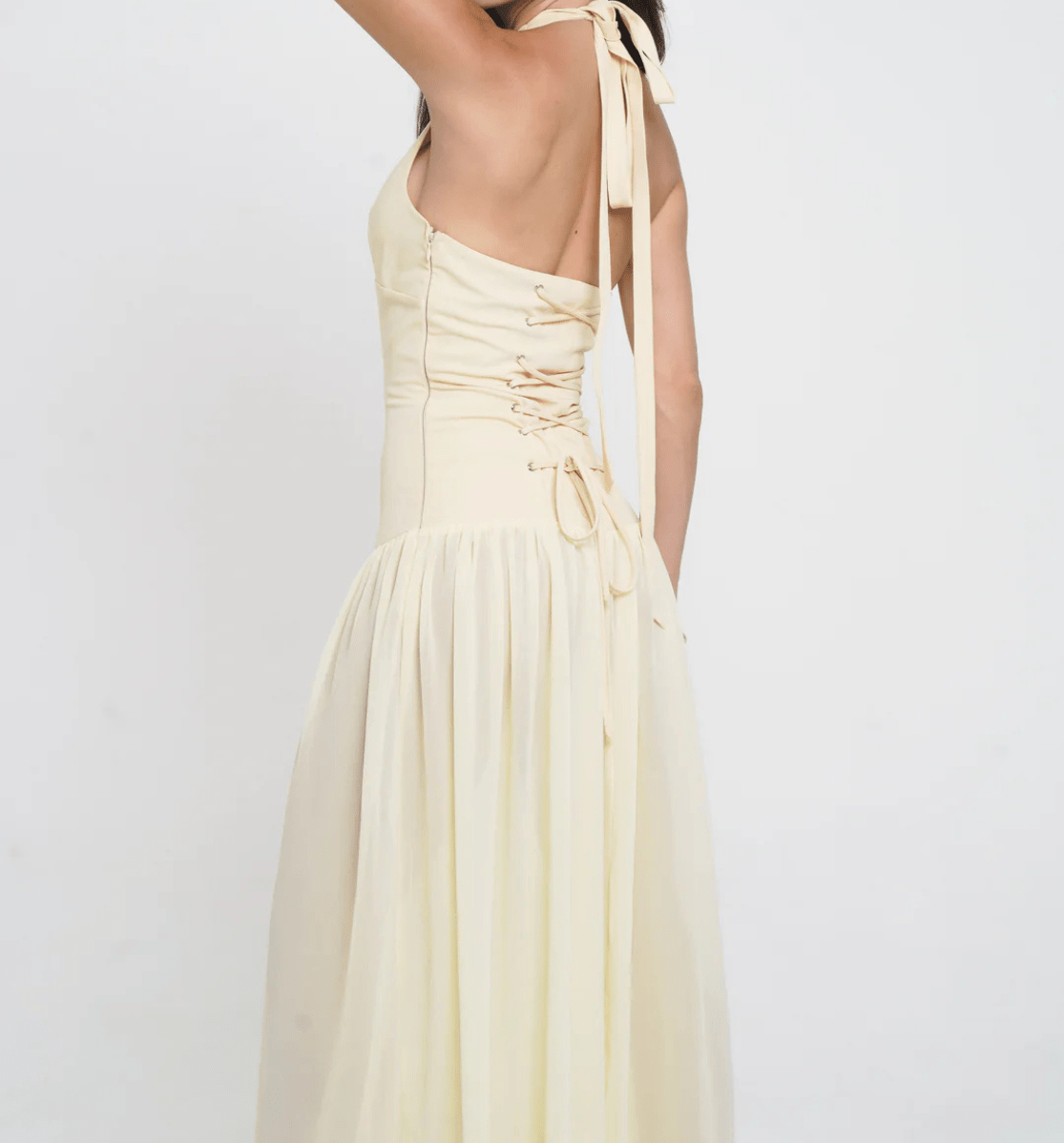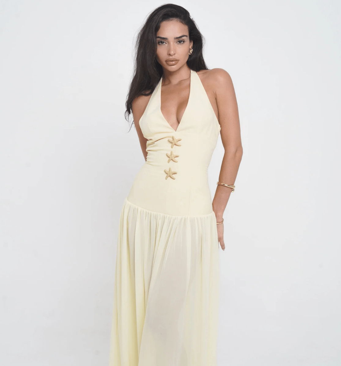 Transform your wardrobe with NOVAIA. Our captivating dress boasts a halter neck, corset back, and removable gold starfish hardware for a unique touch. Crafted from light, breathable fabric, it elegantly flows with each step, perfect for summer affairs. Embrace the luxury of customizable fit and flattering waistline.