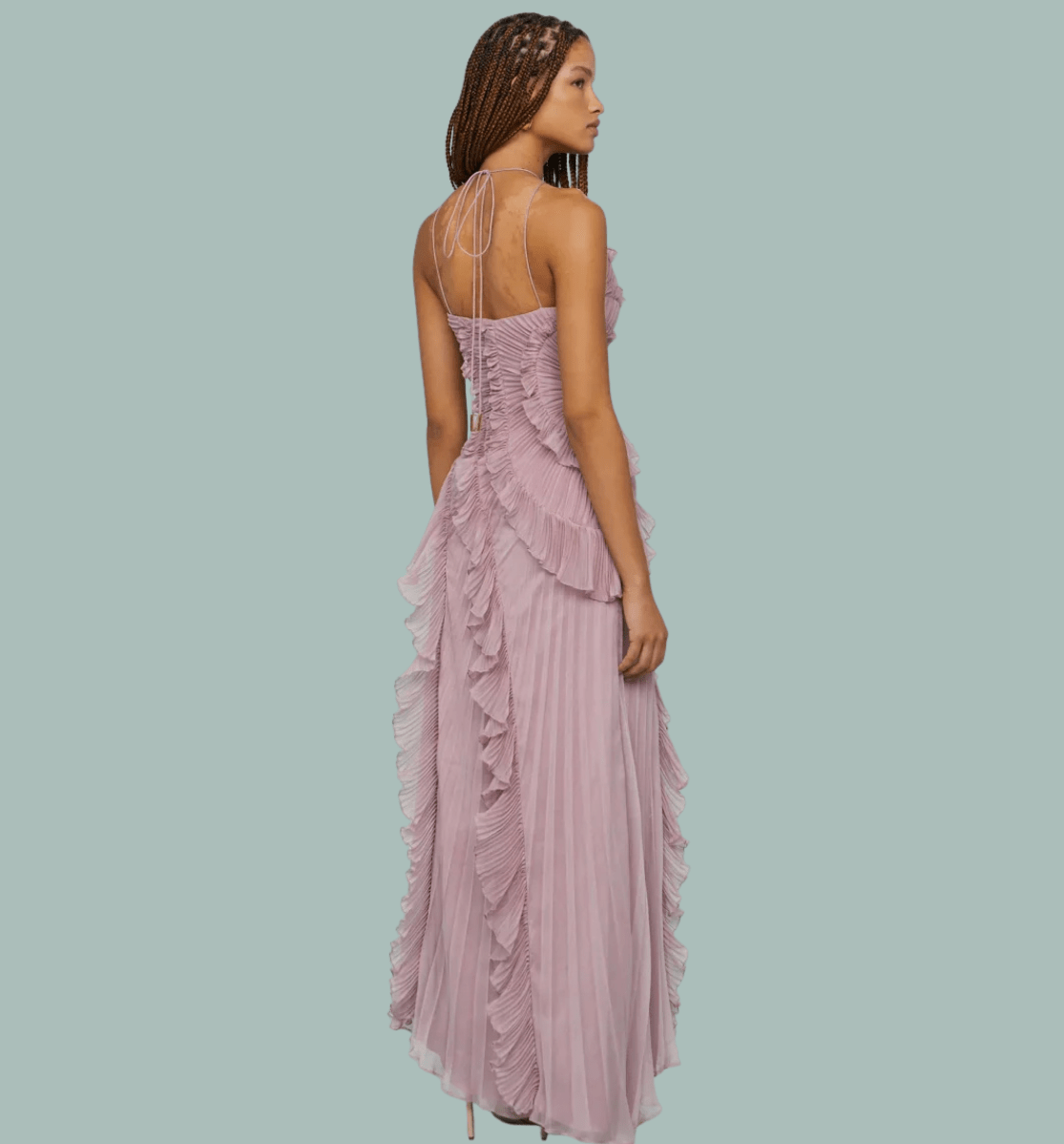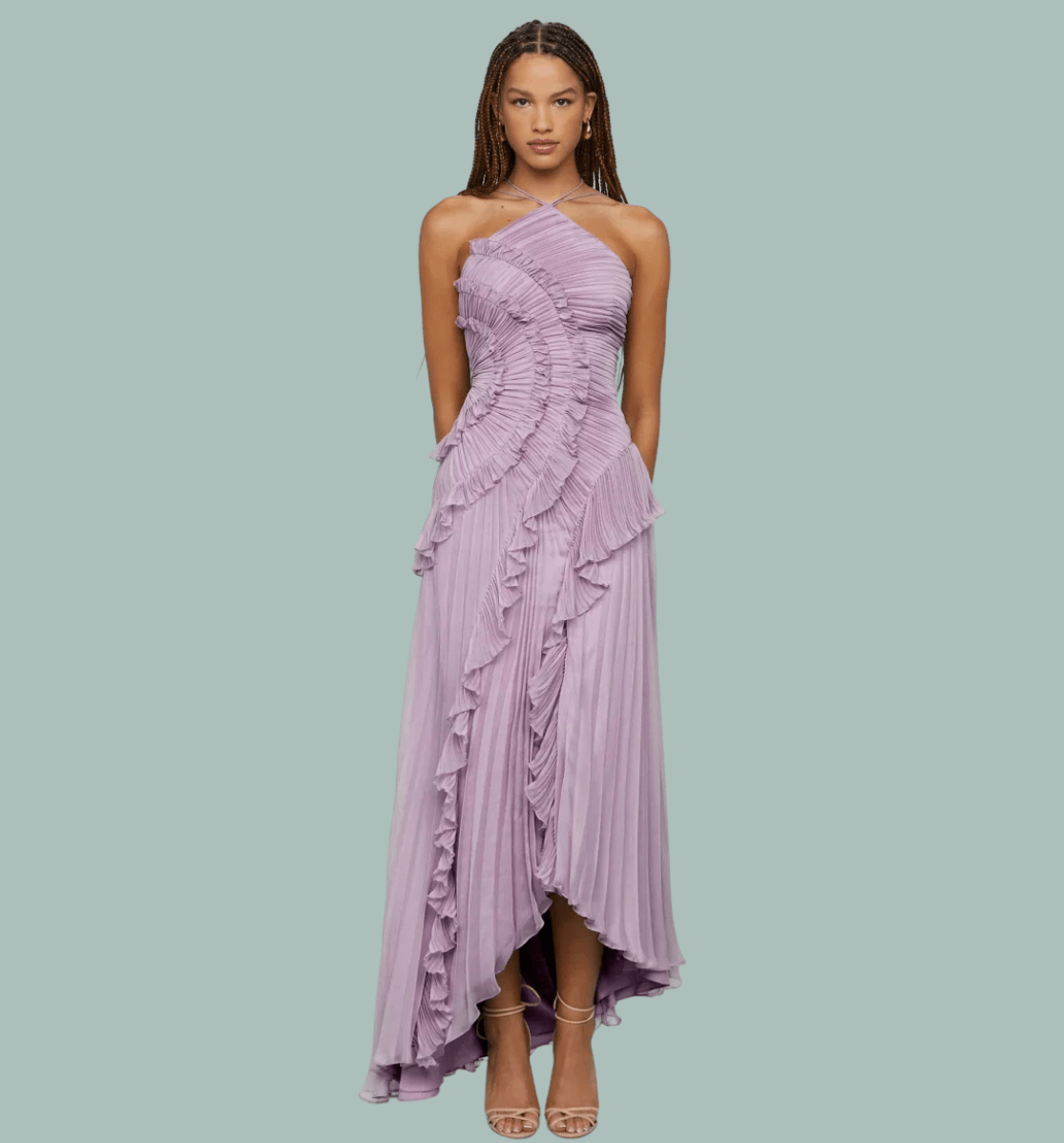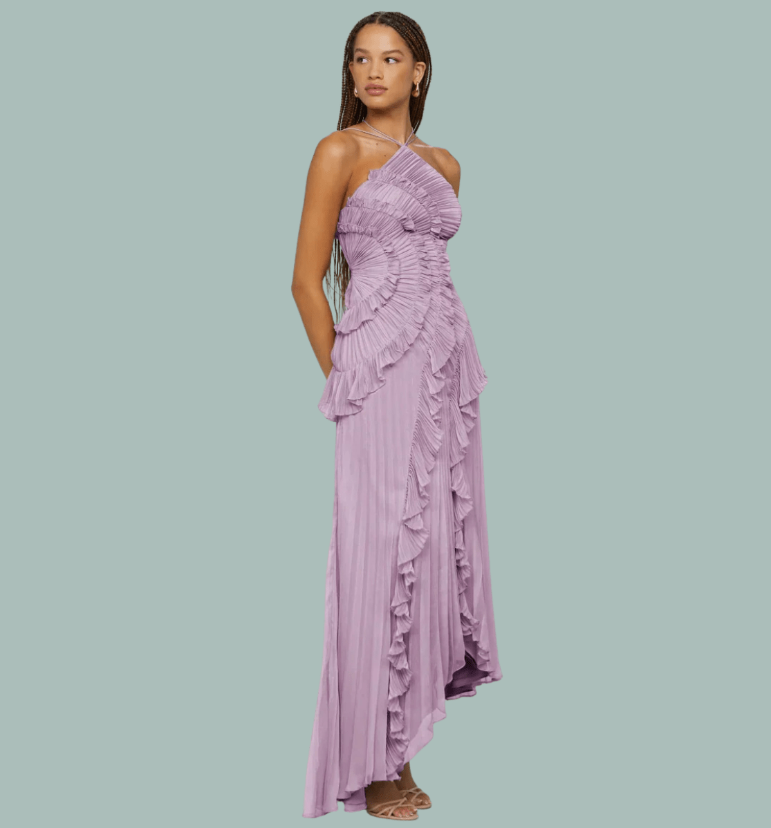 Romantic lilac pleated maxi dress with cascading ruffles and a halter neckline. Perfect for summer events, vacations, and evening occasions. ✨