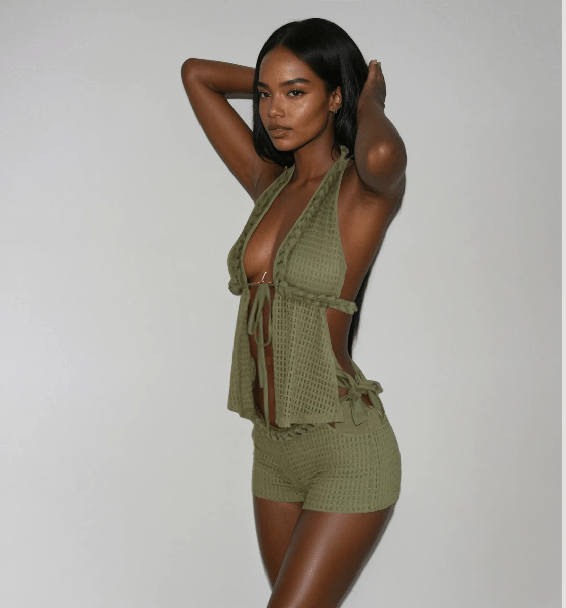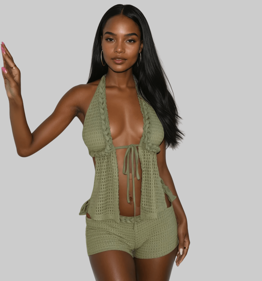 Introducing REMI, the ultimate beach vacay co-ord. Designed with a stylish crochet top and matching shorts, it exudes elegance and sophistication in a gorgeous green tone. Perfect for a day at the beach or a romantic dinner, this versatile outfit elevates your summer wardrobe.