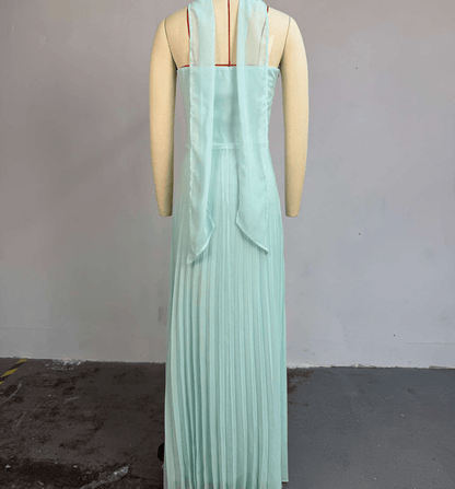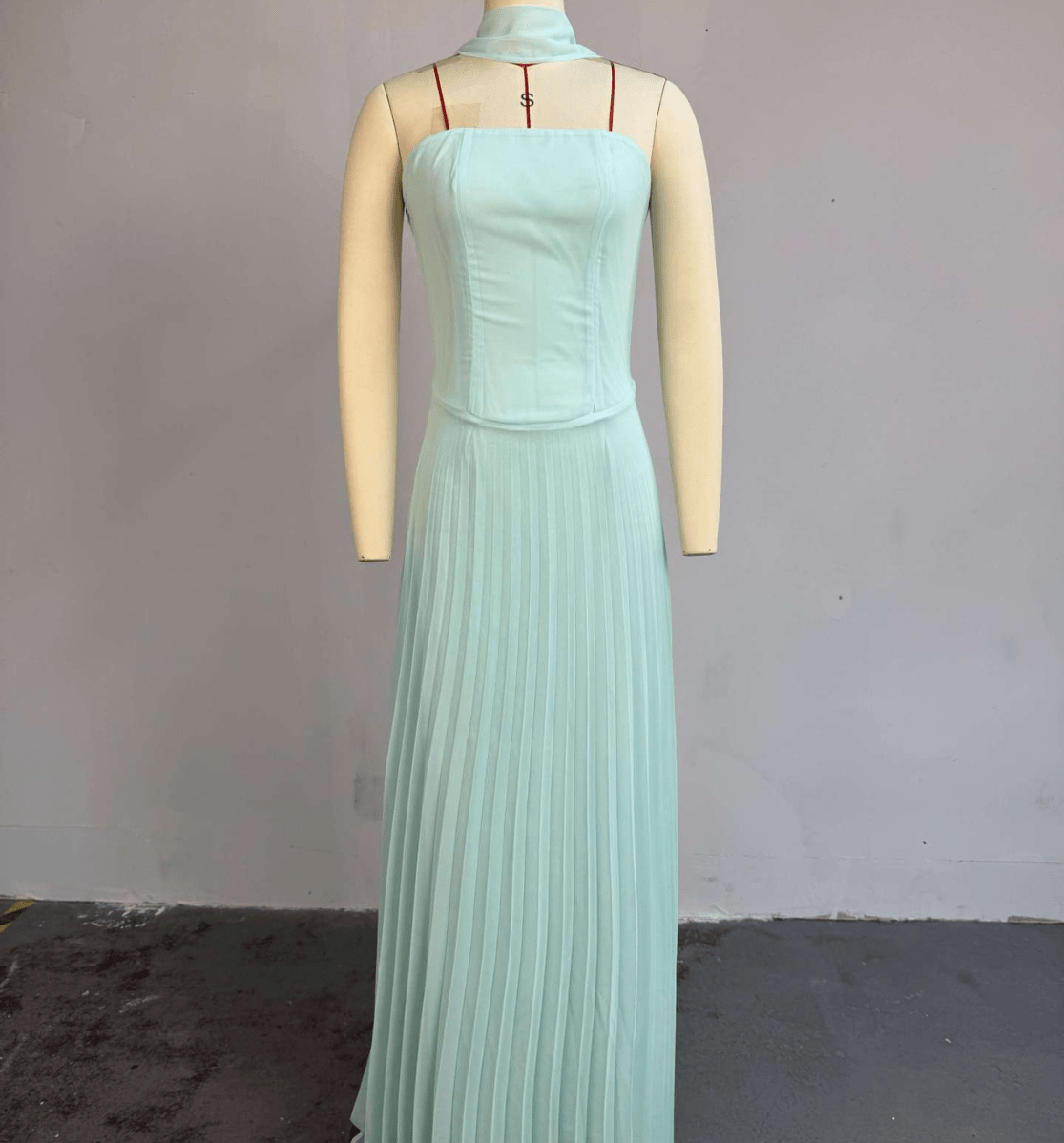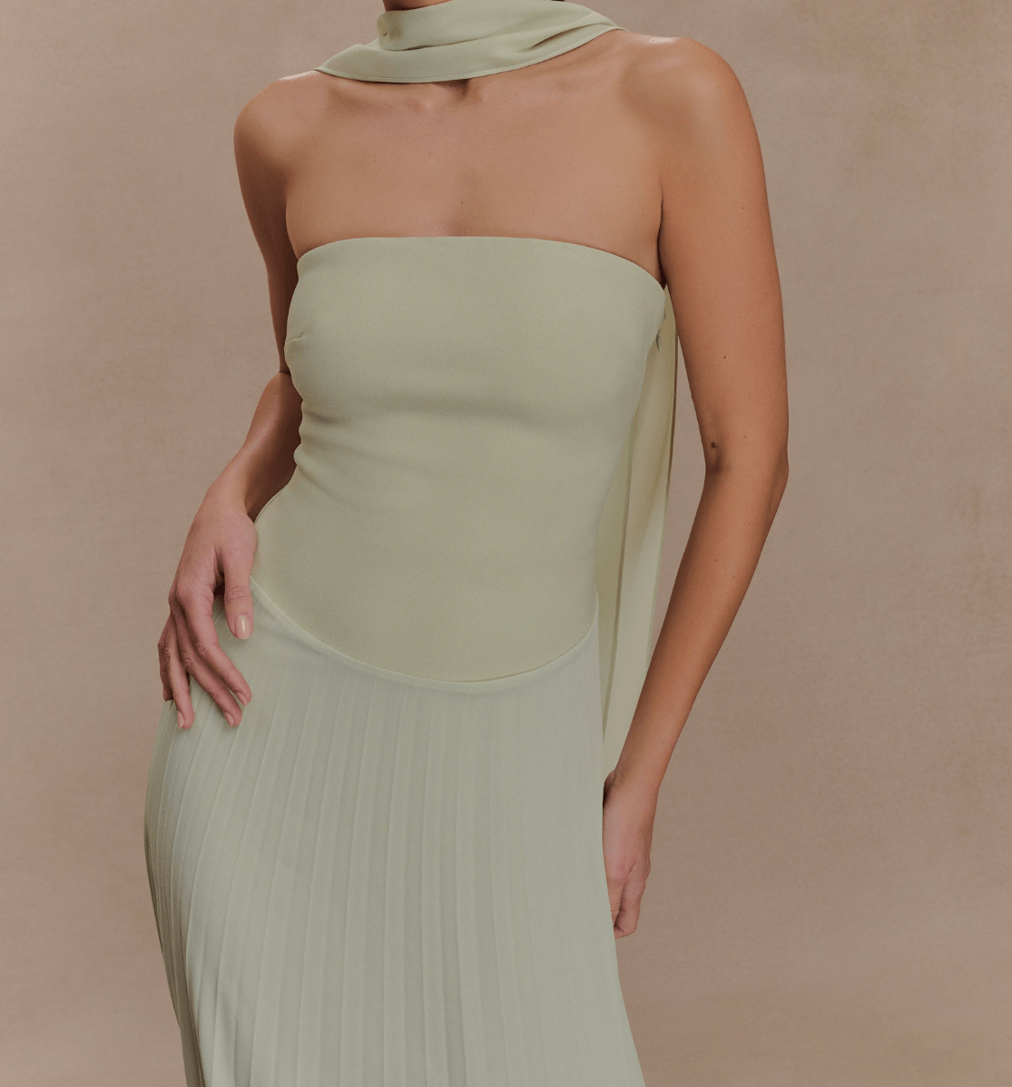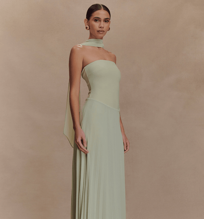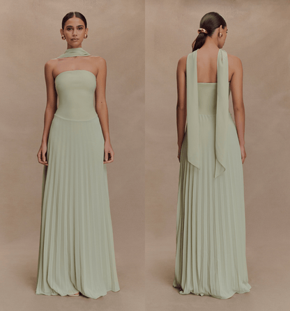 Reyla Maxi is elegance in motion—strapless with grip tape, a pleated skirt, and a removable scarf. Perfect for garden soirées or golden-hour glam.