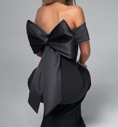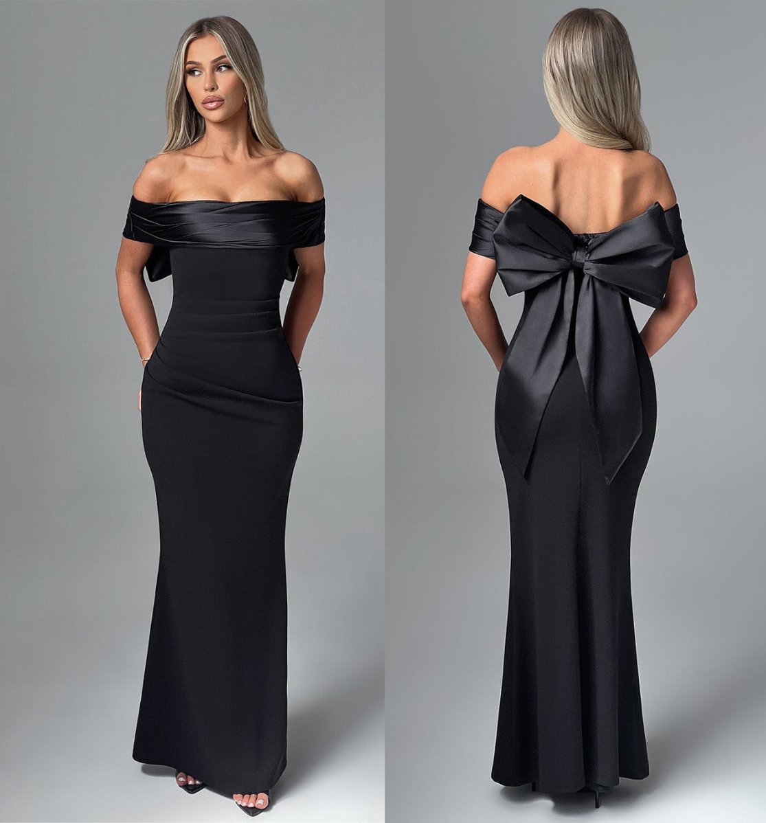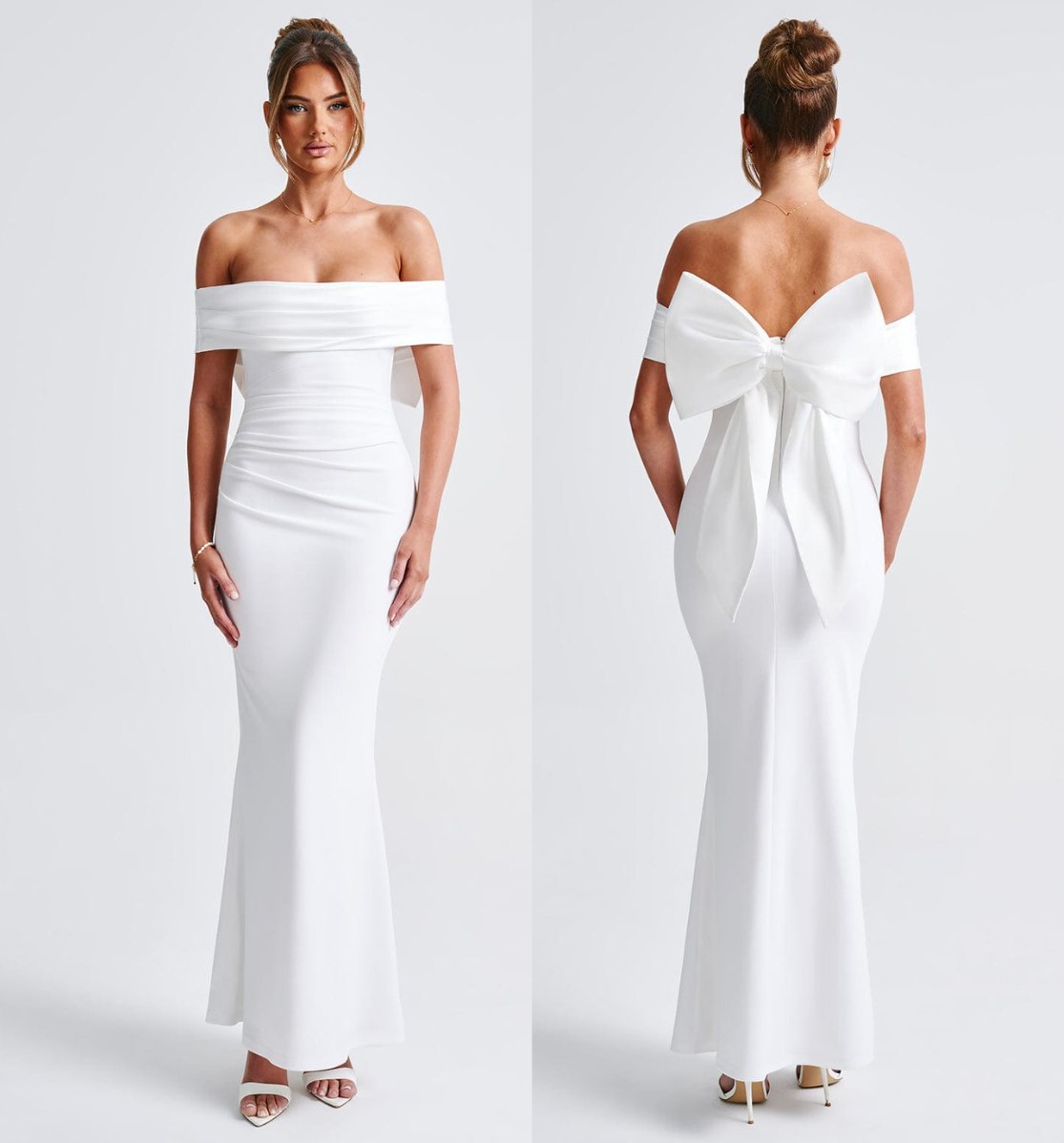 Experience the ultimate in elegance with the SYLVIE dress. Made from luxurious stretch crepe, it beautifully contours and flares at the skirt. A pleated satin bardot panel neckline, paired with a removable bow, creates a stunning silhouette. Finished with waist pleats, this dress is perfect for your dream wedding.