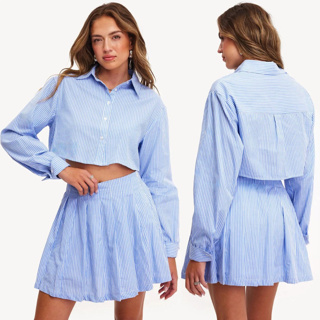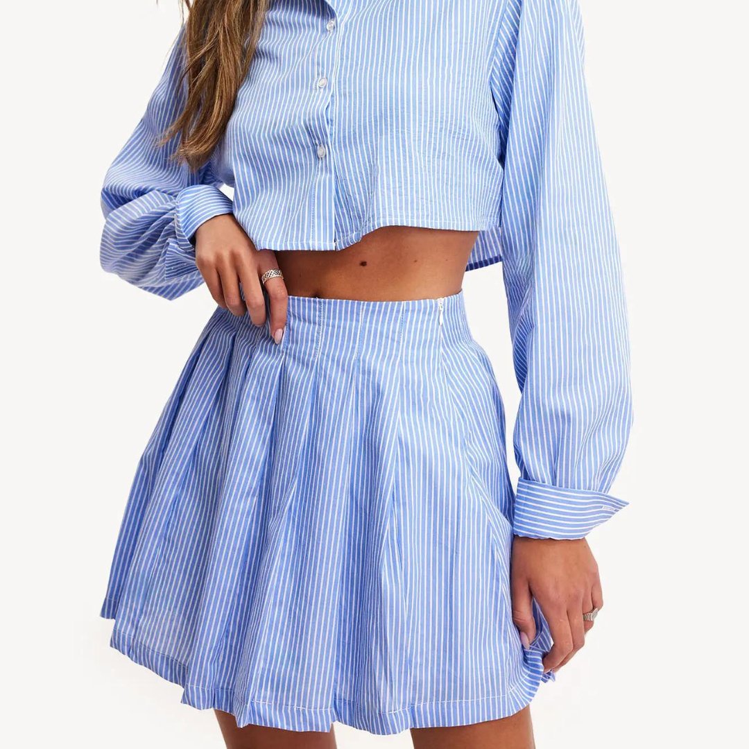 Stay stylish and comfortable with this UTILITY CHIC outfit - a white and blue striped cropped shirt paired with a versatile mini skater skirt. Perfect for any occasion, this ensemble exudes a modern and chic look while providing ease of movement.