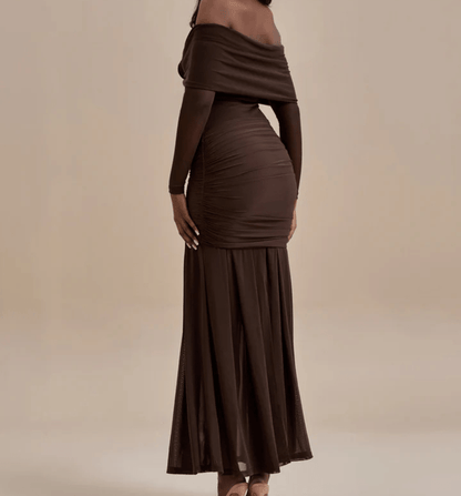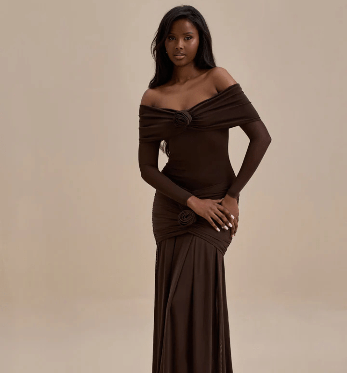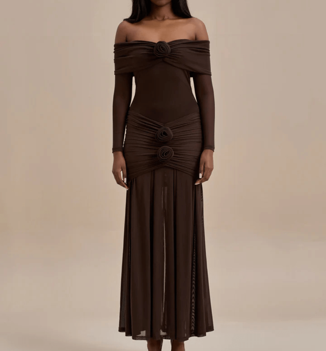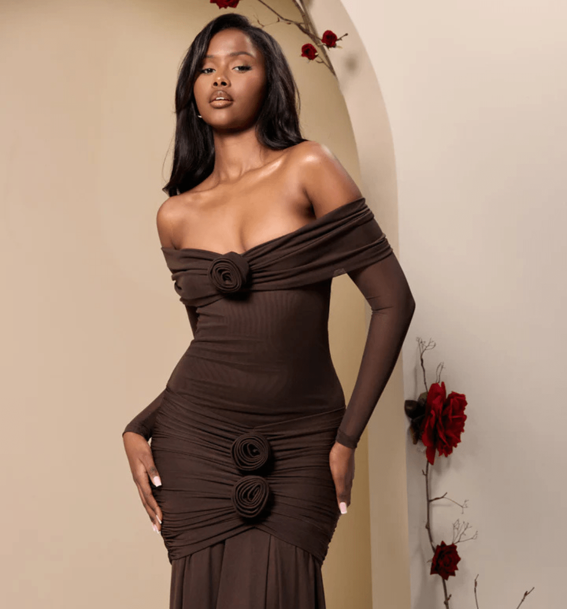 Indulge in the luxury of VIVIA's Rose Maxi Dress in Chocolate. Made from a soft, buttery mesh and adorned with gathered folds, ruching, and delicate rose detailing, this dress is perfect for any occasion. Whether it's a romantic date night or a fun girls night out, this dress will make you feel elegant and sophisticated. You won't be able to resist her charm.
